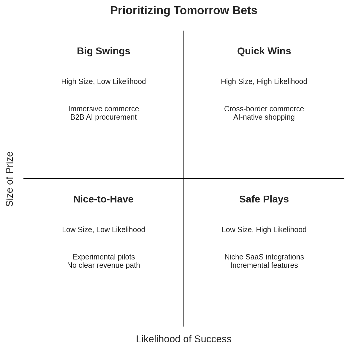Example: Cross-border commerce in proven regulated marketsBig Swings (High Size, Low Likelihood) – Place lightweight bets to learn and position early.